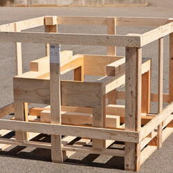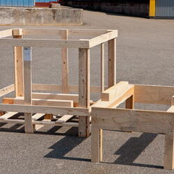 Diese Einwegpalette ist mit einem Verschlag ohne Deckel sowie einem herausnehmbaren Einsatz kombiniert. Damit eignet sie sich beispielsweise für den Versand von Trommeln: Dazu wird der Einsatz zum Einsetzen der ersten Trommel herausgenommen und anschließend für die zweite Trommel wieder eingesetzt und fertig verpackt.