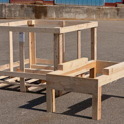 Auch für diese individuelle Maßanfertigung sind alle Holzverbindungen mit durchgehenden Schloss-Schrauben oder Gewindestangen ausgeführt, teilweise auch mit Schlüsselschrauben. Alle Schraubenenden sind mit großen Holzbauschrauben versehen, damit die jeweiligen Verbindungen fest angezogen werden können.