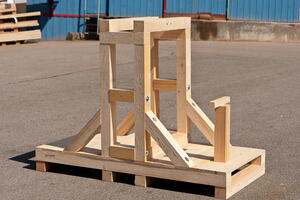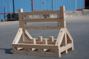 Dieses Transportgestell für schwere Maschinenteile ist ein individuelle Anfertigung nach Kundenauftrag. Das Gestell wird auf den Montageplatz gestellt, so dass das betreffende Maschinenteil montiert werden kann. Anschließend wird das Maschinenteil gesichert und kann dann direkt versendet werden.